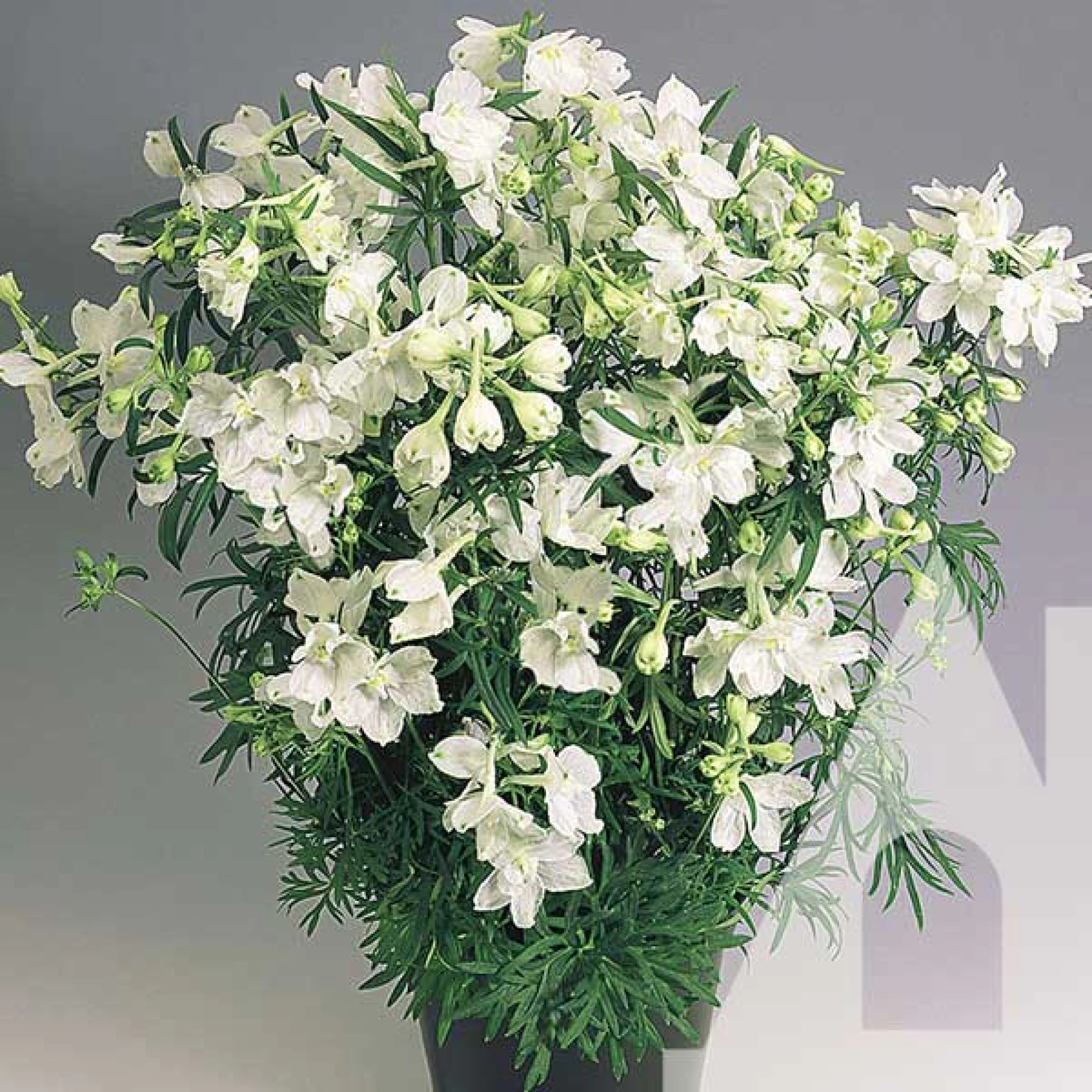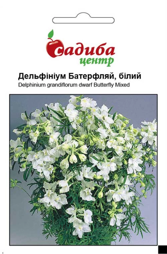 Дельфініум Батерфляй білий - трав’янистий багаторічник. Утворює міцні прямостоячі стебла висотою до 40 см. Квіти великі, білого кольору, 3,5-4 см у діаметрі, зібрані у кисті. Насіння сіють у квітні на розсаду, злегка присипають грунтом. Накривають склом чи поліетиленом і регулярно поливають. Після появи сходів скло знімають. У відкритий грунт рослини висаджують в травні, дорощують до осені чи весни наступного року і висаджують на постійне місце на відстані 30-40 см. Якщо висіяти насіння у відкритий грунт у квітні-травні, то цвітіння настає на другий рік. Морозостійка, посухостійка рослина. Використовують для створення змішаних груп, рабаток, в міксбордерах і для зрізу.
