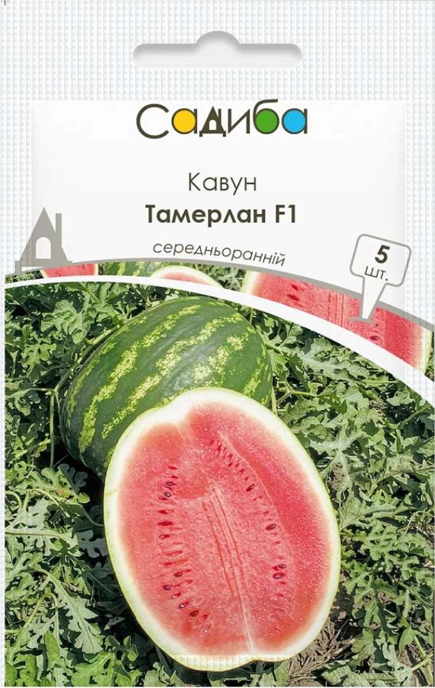 Кавун Тамерлан F1 - середньоранній (65-70 днів) гібрид типу Кримсон Світ для вирощування у відкритому ґрунті та під укриттям, через розсаду або прямим посівом. Плоди великі округло-овальні, вагою 12-16 кг, із щільним хрумким червоним м’якушем з неперевершеним ароматом і відмінними смаковими якостями (близько 12% цукру). Врожайність може досягати 120 т/га. Потужне листя добре захищає плоди від опіку. Гібрид отримав позитивні відгуки за стресостійкість, високу якість плодів та гарну лежкість. Вирощується для свіжого споживання, переробки (можливе квашення).