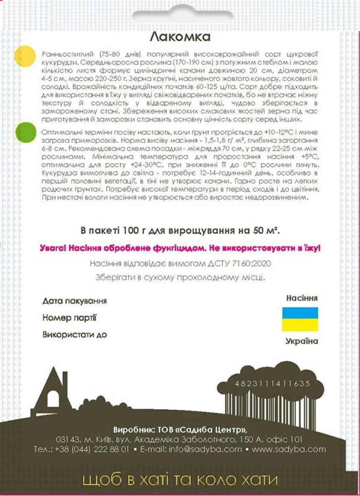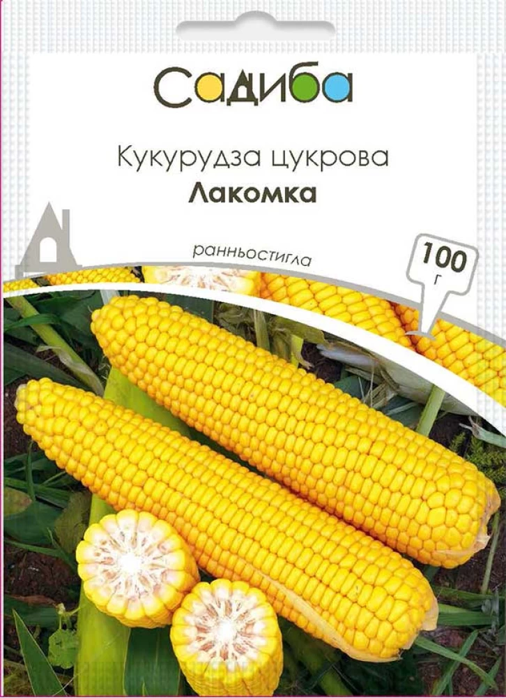 Кукурудза Лакомка - ранньостиглий (75-80 днів) популярний сорт цукровий кукурудзи. Середньоросла рослина (170-190 см) з потужним стеблом і малою кількістю листя формує циліндричні качани довжиною 20 см, діаметром 4-5 см, масою 220-250 г. Зерна крупні, насиченого жовтого кольору, соковиті й солодкі. Врожайність кондиційних початків 60-125 ц/га. Сорт добре підходить для використання в їжу у вигляді свіжовідварених початків, бо не втрачає ніжну текстуру й солодкість у відвареному вигляді, чудово зберігається в замороженому стані. Збереження високих смакових якостей зерна під час приготування й заморозки становить основну цінність сорту серед інших.