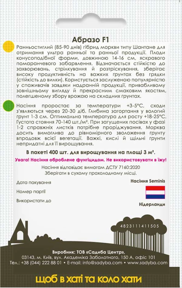 Морква Абразо F1 - ранньостиглий (85-90 днів) гібрид моркви типу Шантане для отримання ультра ранньої та ранньої продукції. Плоди конусоподібної форми, довжиною 14-16 см, яскравого помаранчевого забарвлення. Відзначається стійкістю до захворювань, стрілкування й розтріскування, зберігає високу продуктивність на важких ґрунтах без грядки ( стійкість до вилки). Користується заслуженою популярністю у споживачів завдяки надранній продукції, привабливому зовнішньому вигляду й прекрасними смаковими якостями, полегшеному збору врожаю на складних грунтах.