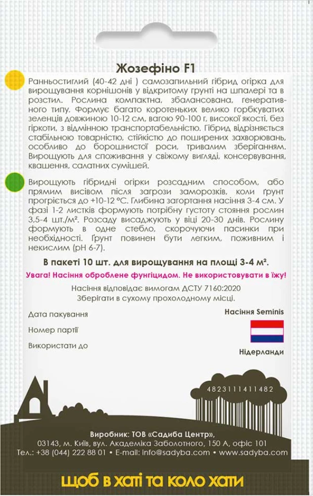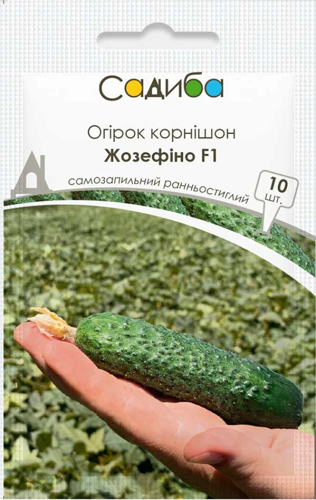 Огірок Жозефіно F1 - ранньостиглий (40-42 дні ) самозапильний гібрид огірка для вирощування корнішонів у відкритому грунті на шпалері та в розстил. Рослина компактна, збалансована, генеративного типу. Формує багато коротеньких велико горбкуватих зеленців довжиною 10-12 см, вагою 90-100 г, високої якості, без гіркоти, з відмінною транспортабельністю. Гібрид відрізняється стабільною товарністю, стійкістю до поширених захворювань, особливо до борошнистої роси, тривалим зберіганням. Вирощують для споживання у свіжому вигляді, консервування, квашення, салатних сумішей.