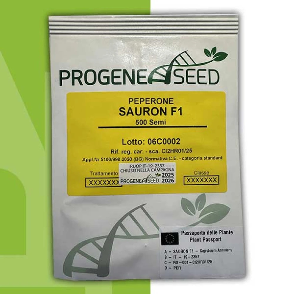 Перець Саурон F1 – урожайний гібрид, має міцний, помірно сильний кущ, з правильними та короткими міжвузлями. Відмінне формування зав'язі забезпечує високу та однорідну кількість якісних плодів на всій рослині. Плоди мають вузько-конусоподібну форму, салатового кольору в технічній стиглості та насиченого червоного в біологічній. Перець має довжину плоду близько 22 см, діаметром 5 см, середня вага близько 300 г. Гібрид має високу стійкість до вірусу тютюнової мозаїки та середню стійкість до вірусу бронзовості томатів. Перець вирощують в теплицях та плівкових укриттях.