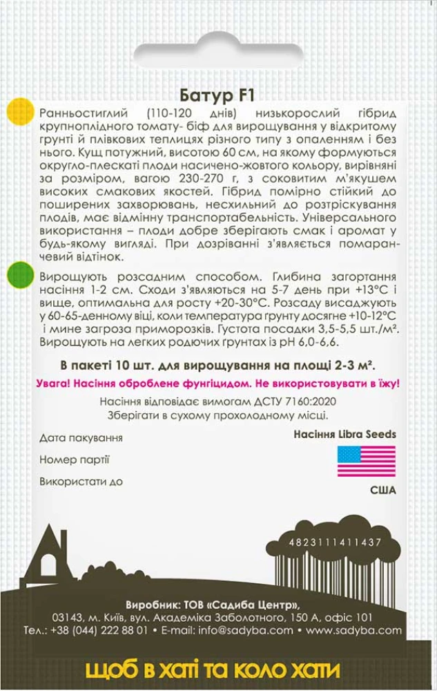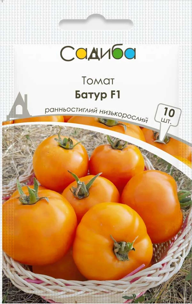 Томат Батур F1 - ранньостиглий (110-120 днів) низькорослий гібрид крупноплідного томату- біф для вирощування у відкритому грунті й плівкових теплицях різного типу з опаленням і без нього. Кущ потужний, висотою 60 см, на якому формуються округло-плескаті плоди насичено-жовтого кольору, вирівняні за розміром, вагою 230-270 г, з соковитим м’якушем високих смакових якостей. Гібрид помірно стійкий до поширених захворювань, несхильний до розтріскування плодів, має відмінну транспортабельність. Універсального використання - плоди добре зберігають смак і аромат у будь-якому вигляді. При дозріванні з’являється помаранчевий відтінок.