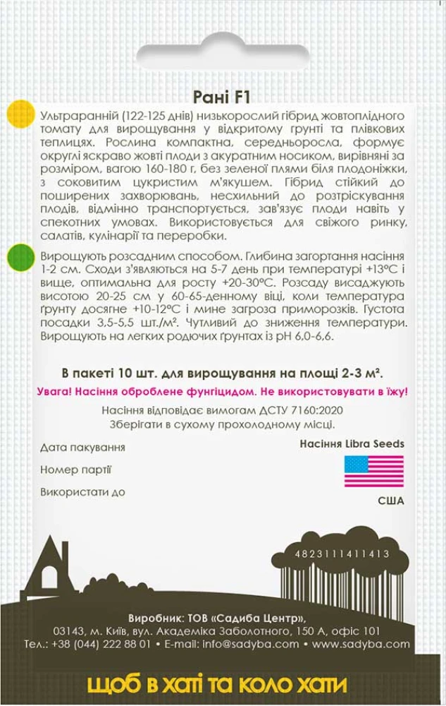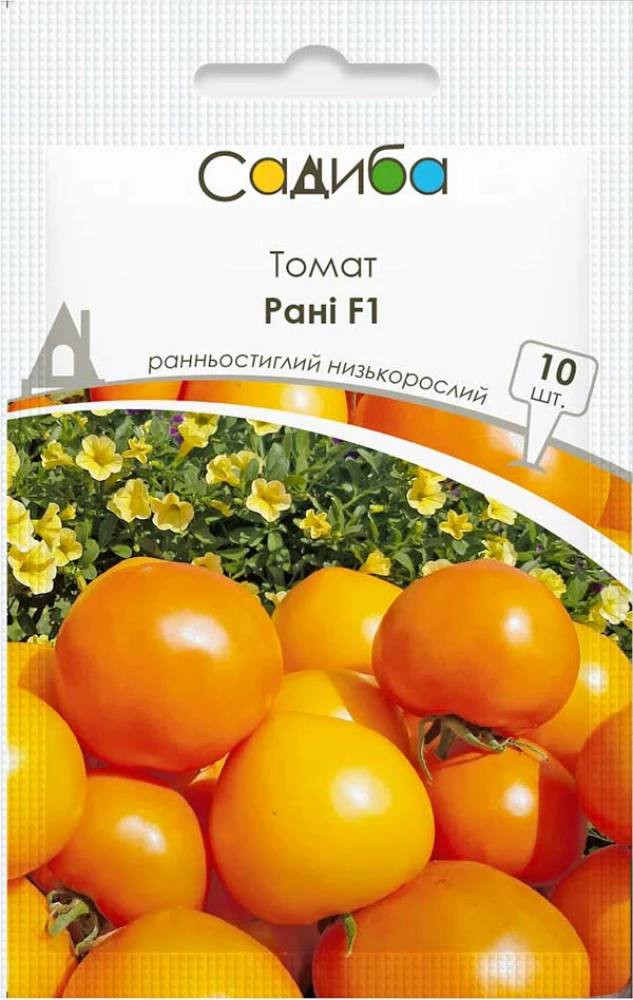 Томат Рані F1 - ультраранній (122-125 днів) низькорослий гібрид жовтоплідного томату для вирощування у відкритому грунті та плівкових теплицях. Рослина компактна, середньоросла, формує округлі яскраво жовті плоди з акуратним носиком, вирівняні за розміром, вагою 160-180 г, без зеленої плями біля плодоніжки, з соковитим цукристим м’якушем. Гібрид стійкий до поширених захворювань, несхильний до розтріскування плодів, відмінно транспортується, зав’язує плоди навіть у спекотних умовах. Використовується для свіжого ринку, салатів, кулінарії та переробки.