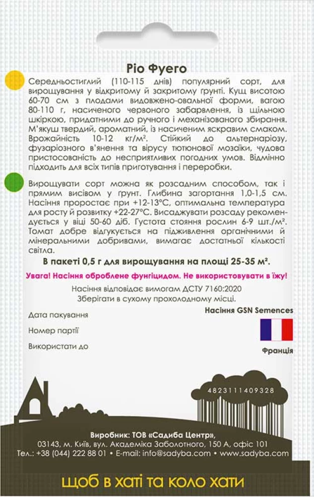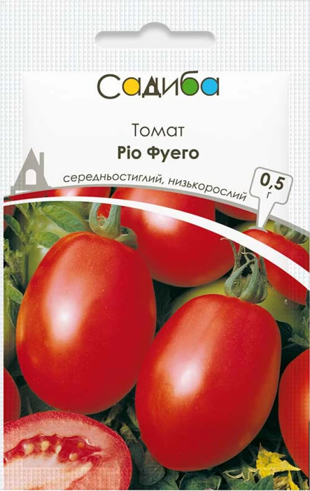 Томат Ріо Фуєго - середньостиглий (110-115 днів) всесвітньо популярний сорт, перевірений часом, для вирощування у відкритому й закритому ґрунті в будь-якій кліматичній зоні. Кущик детермінантного типу, середньої сили росту, висотою 60-70 см. Плоди видовжено-овальної форми, вагою 80-110 г, насиченого червоного забарвлення, із щільною шкіркою, дозрівають дружно, придатні до ручного й механізованого збирання. М’якуш дуже твердий, ароматний, із насиченим яскравим смаком. Урожайність 10-12 кг/м2. Городники й фермери високо оцінують сорт за стійкість до альтернаріозу, фузаріозного в’янення та вірусу тютюнової мозаїки, чудову пристосованість до несприятливих погодних умов без погіршення продуктивності, високу якість плодів. Відмінно підходить для салатів і всіх типів приготування й переробки.